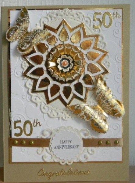 This card below has been created using the new spellbinders 'cut and tuck' range of dies, this one is called floral burst and as the website says 'the new Spellbinders Shapeabilities Cut • Fold • Tuck die templates creates intricate geometric designs in a single pass.' They are rather spendid, its a shame the photo below isn't clearer as they make a fabulous card . The butterflies are a nice touch and are from Hunky Dory and the floral Oval is behind the main flower again cut out of cream card, apoligies again for photo quality the backing paper, is just some plain white run though the 'fancy hearts' M-bossibilities folder. Simple buy classic. I choose to make mine a Golden wedding Anniversary card but simply change the gold to silver and you can celebrate a 25th just as easily
